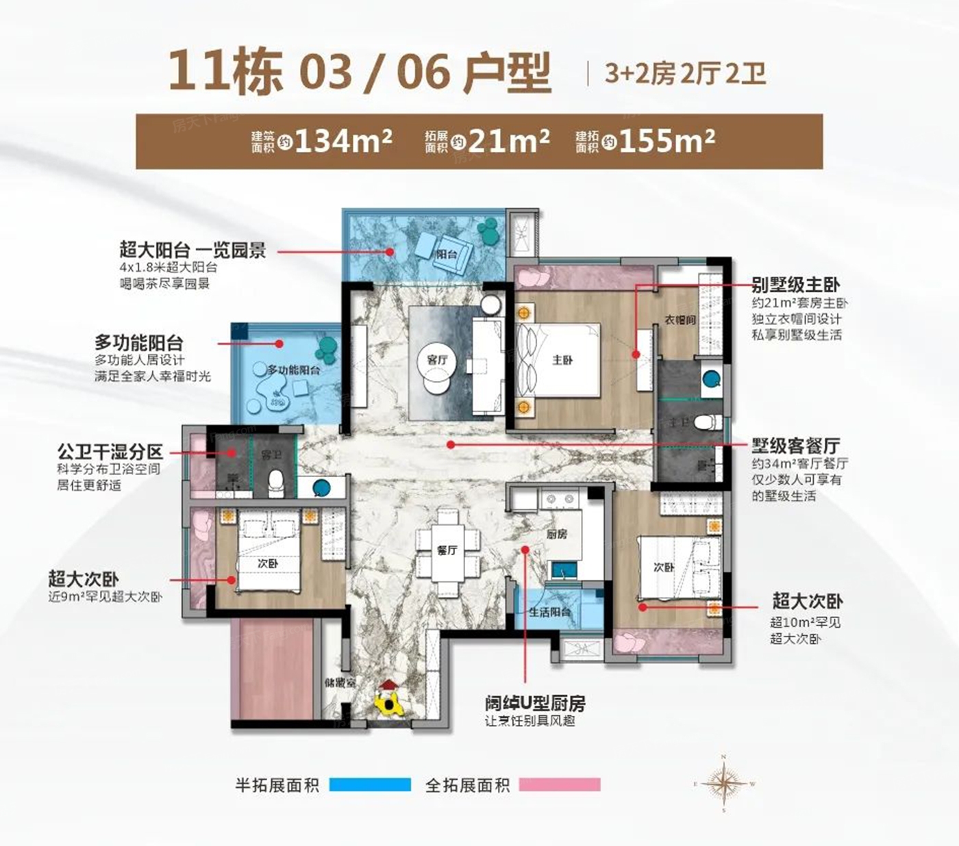 3室2厅2卫开元·西湖春天 平层户型·建面/134㎡